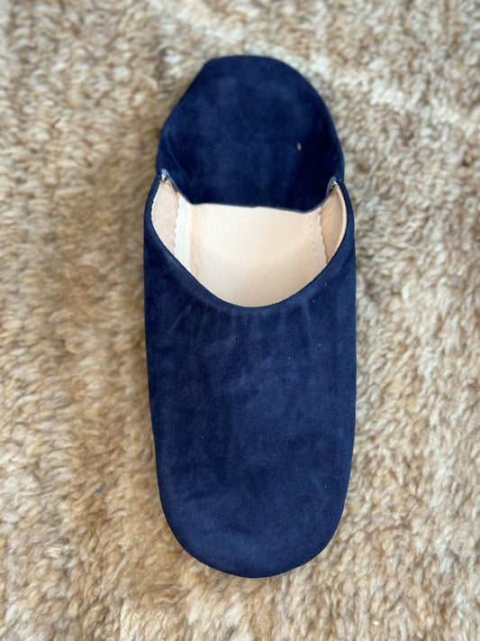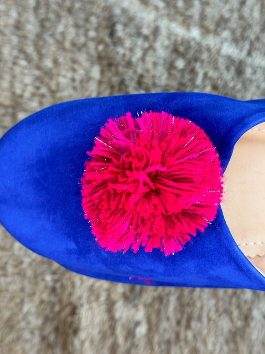 Babouches Femmes en daim bleu majorelle pompons fuschias et argentés
