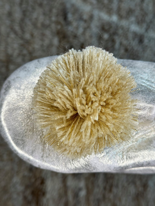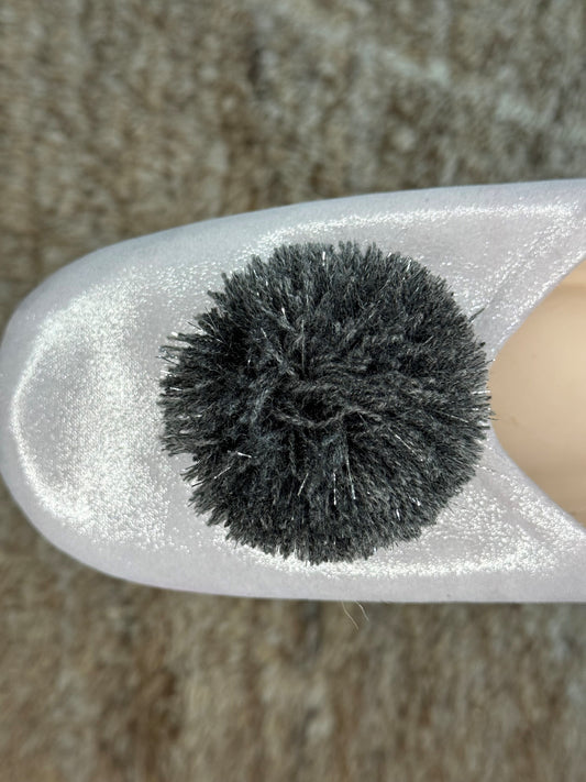 Babouches Femmes en cuir argenté pompons gris et argentés